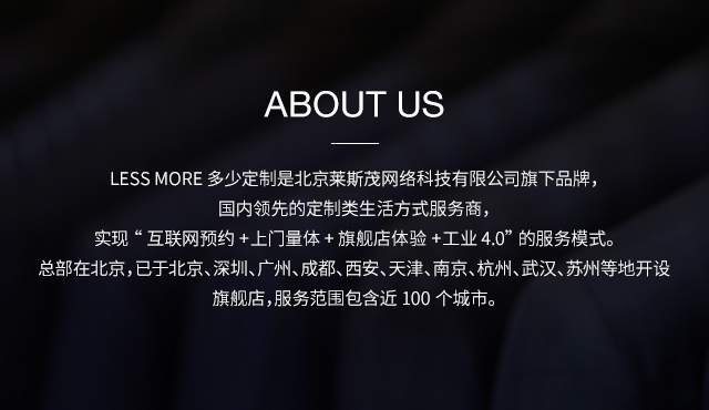 LESS MORE 多少定制是能夠提供男士全品類定制產(chǎn)品的生活方式品牌,對(duì)于中國(guó)商務(wù)男士來(lái)說,定制是對(duì)西裝最認(rèn)真的態(tài)度。